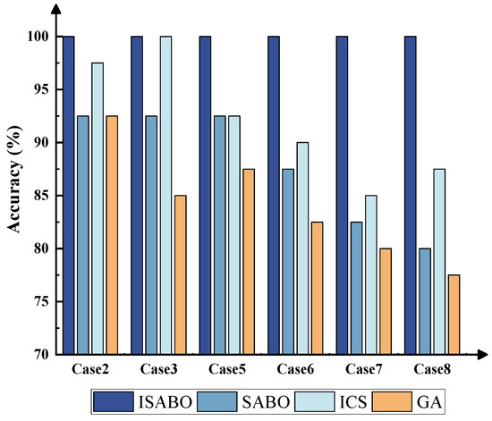 Table 7 and Table 8 show that under the various fault conditions set, the ISABO algorithm needs the least number of iterations to find the fault location. When locating the single-section fault condition, the number of iterations is within 10 times; when locating multi-section fault conditions, the number of iterations increases slightly, but the change is not large. In contrast, other algorithms significantly increase the number of iterations with the increase in the complexity of the working conditions. In addition, in terms of positioning accuracy, the accuracy of the ISABO algorithm is 100% under various working conditions, while the accuracy of other algorithms decreases significantly with the increase in the number of fault sections and the difference in distortion information. To more intuitively see the differences in the positioning accuracy of each algorithm, this study selects the accuracy obtained with Case 2, Case 3, Case 5, Case 6, Case 7, and Case8 and draws a histogram, as shown in Figure 8. From Figure 8, the positioning performance of the ISABO algorithm has excellent stability and good adaptability to various complex working conditions. Therefore, the ISABO algorithm has good speed, accuracy, and fault tolerance when applied to the distribution network fault section location problem.