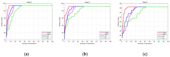 Ensure that the T_max of each algorithm is 100. The experiments of Case 3, Case 6 and Case 8 in Table 7 are carried out. The experimental comparison results of the four algorithms are shown in Figure 9a–c.
