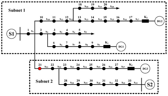 Distribution networks sometimes involve the operation of interconnection switches to meet the operation’s needs, reduce fault losses, etc. To investigate the effect of interconnection switch operation on fault location in this study, a main power supply, S2, is added at Section 33 of the network shown in Figure 4, while switch 21 is changed to an interconnection switch, and the modified network diagram is shown in Figure 10. The red nodes in the figure represent Interconnection Switch.