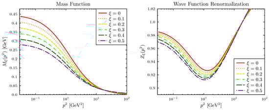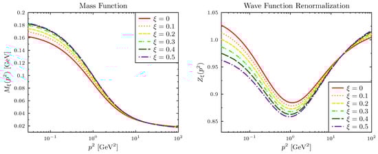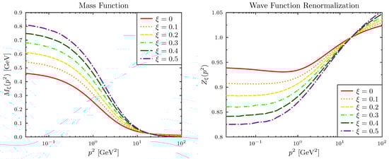 In Figure 3 we present our solutions for and with the full gauge-dependent STI vertex defined by Equations (6) to (17). Clearly, the trend of a rising mass function and a dropping wave renormalization in the low-momentum region, observed with the ghost-corrected Ball-Chiu vertex, is corroborated when the transverse vertex is included. The contrast with the functional behavior in Figure 1 is evident, in particular that of which now decreases steadily with and saturates in the infrared domain. Moreover, the quark-ghost scattering form factor, , is calculated in a dressed approximation [28,31,32] and dynamically generated in consistency with and . We abstain from discussing the gauge-dependent solutions here and refer to Ref. [23] for details.