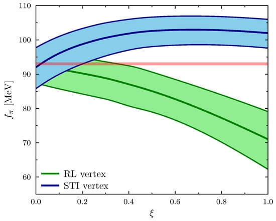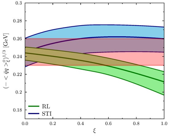 Gauge dependence of the chiral quark condensate obtained with two different quark–gluon vertices in the DSE. The pink-, green-, and blue-shaded error bands stem from the statistical errors of the lattice QCD predictions for the gluon and ghost propagators [24] on which the gauge-dependent solutions of and depend via Equations (1) and (2). The pink horizontal band indicates the region of a gauge-independent quark condensate as implied by the LKFTs in QCD, where the uncertainty is due to the statistical error of the gauge propagators in Landau gauge.