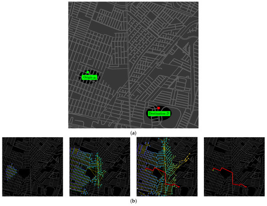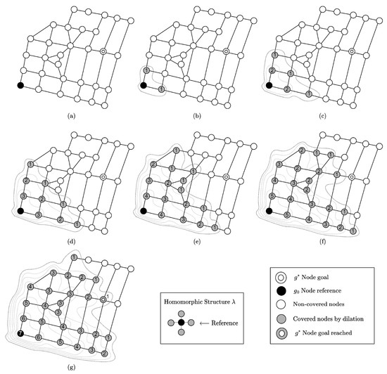 The information about the city’s avenues can be represented as a graph. This graph can be used to generate a search path, as illustrated in Figure 4 based on the sample used in [37], starting from two positions (see Figure 4a), the starting point and the destination point D. The subsequent graphs in Figure 4b depict the process of covering the graph. The nodes are expanded from the starting node until they reach the destination set D. A dilation operator influences the number of times a node is used to calculate the path solution. The frequency of this occurrence establishes a natural order relation that determines the shortest trajectory based on the connections made to the reached nodes.