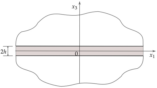 We consider small-amplitude free vibrations of an isotropic linearly elastic layer of thickness , which is surrounded by an inviscid compressible fluid. The Cartesian coordinate system is set up in such a way that axis goes through the mid-plane of the layer (see Figure 1), whereas axis , perpendicular to plane , is not shown in the figure. The following notations will be used throughout the paper: E is Young’s modulus, is Poisson’s ratio, and are Lamé elastic constants, and are solid and fluid densities, respectively, and are the longitudinal and transverse wave speeds in solids, respectively, and is the wave speed in fluids.