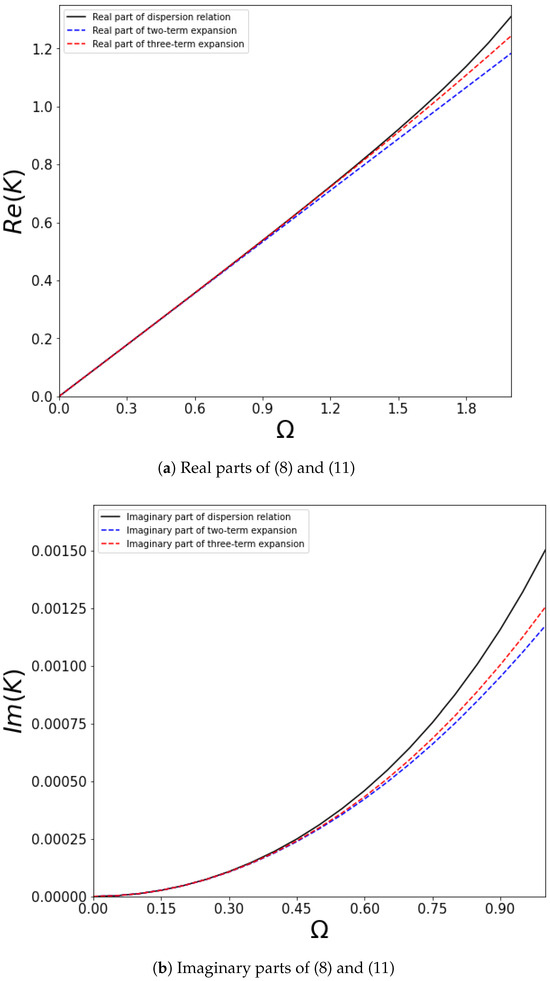 Dispersion relation (8) (solid black line) together with the two-term asymptotic expansion (11) (blue dashed line)—with coefficients and of (12) and the three-term asymptotic expansion (11) (red dashed line)—with all three coefficients of (12); real parts shown in (a) and imaginary parts shown in (b).