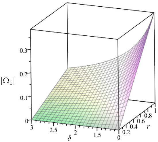 Figure 3 then illustrates an absolute value of a purely imaginary coefficient as a function of density ratio, r, and ratio of wave speeds, , for a fixed value of . This provides insight into the effect of these parameters on the dissipation of energy.