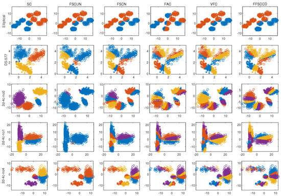 At the preparation step, calculating , , , , , consumes , , , and , respectively. Specifically, is a vector with length n, and L is a matrix with n rows and n columns; hence, the computation of and takes and respectively, and calculating consumes . The indicator matrix Y includes k columns; therefore, the time complexity of both and , is . D is a diagonal matrix whose other elements are 0 except the diagonal; thus, the calculation of , is . The F denotes a matrix with n rows and m columns; thus, the algorithm needs to calculate , . During each iteration, it requires time to compute the objective value for each potential solution and determine the optimal one. The time complexity to update stored is if a superior solution is discovered. Denoting the number of outer iterations as z, the overall time complexity of FFSC can be expressed as , which can be further simplified as because .
