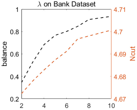 In this section, we analyze the effect of the Lagrange multiplier on the performance of FFSC in the experiments. influences the trade-off between clustering quality and fairness. Figure 4 shows the trend of Ncut and balance with different values of on Bank. With an increasing value of , it becomes apparent that the value of Ncut increases, which means clustering quality loss, whereas the fairness of clustering improves.