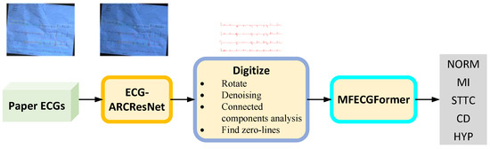 The electrocardiogram (ECG) is the most common pre-screening tool for diagnosing cardiovascular diseases (CVDs) [1,2]. Currently, devices for detecting ECG signals include standard 12-lead electrocardiographs and portable or wearable ECG devices. Compared to other devices, 12-lead electrocardiographs can provide comprehensive, high-quality ECG signals, enabling more accurate classification and diagnosis of CVDs. Recently, researchers have developed many algorithmic approaches to interpreting the digital representations of the ECG waveforms. Although digital ECG methods offer the potential for increased access to ECG-based diagnoses and cardiac care, physical or paper ECGs have been a cornerstone of cardiac care for nearly a century and continue to be widely used, particularly in the Global South. There are likely billions of paper ECGs recorded each year globally [3]. This legacy embodies the variation and evolution of CVDs across different populations, regions, and time. However, proprietary systems with limited interoperability artificially exacerbate barriers to data analysis. Consequently, the digitization of ECGs and access to low-cost analytical tools are essential for capturing the full spectrum of ECG data and enhancing global accessibility of cardiac care [4]. The diagnosis of heart diseases using paper ECGs consists of two stages: digitization of paper ECGs and classification of the resulting digital signals. Currently, several models have been explored to process paper ECGs.