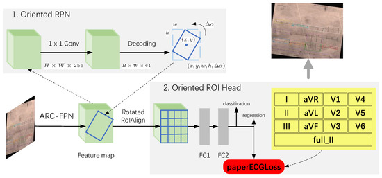 Oriented R-CNN, a two-stage detector based on FPN, comprises an oriented RPN and an oriented R-CNN head. The former generates high-quality oriented proposals, while the latter classifies these proposals and refines their spatial locations through bounding box regression. Oriented R-CNN leverages cross-entropy loss to classify proposals and determine object categories. Smooth L1 loss is adopted to regress the bounding boxes, refining their position, size, and orientation to localize the objects better. The positional distribution of the 26 classes in paper ECG records produced by unified ECG devices is fixed. By leveraging this structural information, this paper proposes paperECGLoss to improve detection performance. Next, we describe it in detail.