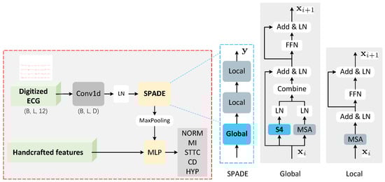 The overall architecture of MFECGFormer for ECG signals classification. This model’s backbone, SPADE, consists of one S4-augmented attention network and two standard multi-head self-attention networks.