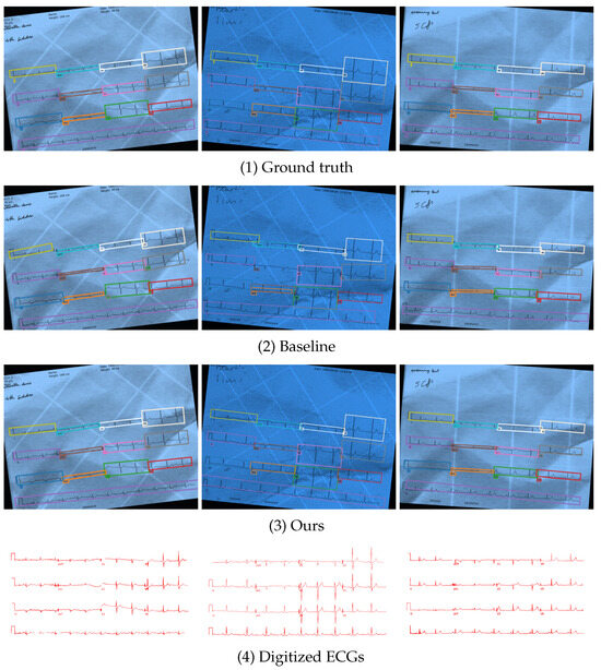 The ARC R-CNN model is used as the baseline model. The proposed model performs better in detecting most categories than other oriented R-CNN-based rotation object detection models. However, we observed a lower accuracy in predicting the names of lead I and II. This issue can be attributed to these two classes’ relatively small pixel occupancy, making them difficult to distinguish from image noise in many samples. Visualization results of detection and digitization for three ECG images from the test set are shown in Figure 4.