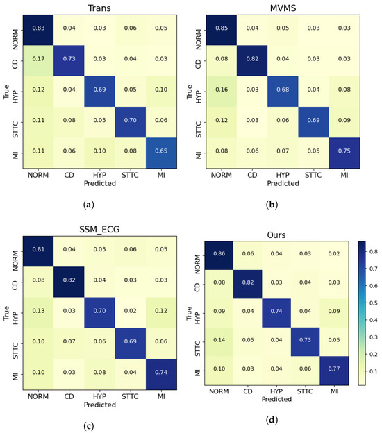 Furthermore, the confusion matrices of different models are illustrated in Figure 6, in which each row shows the predicted distribution for the corresponding category. These results indicate that all models tend to misclassify samples as NORM. This observation aligns with clinical findings where certain ECGs are labeled as both NORM and other abnormal patterns. Moreover, the relatively low recall for the STTC category is mainly attributed to its small proportion in the test set (8.9%). However, although the proportion of the MI category (15.8%) in the test set is comparable to other abnormal categories, its recall is higher, potentially indicating that the proposed model is more effective in learning the characteristic ECG morphologies associated with this category.