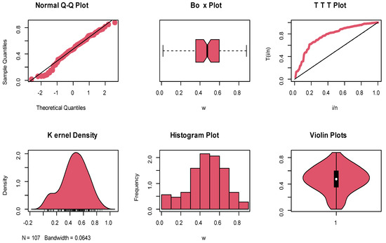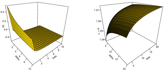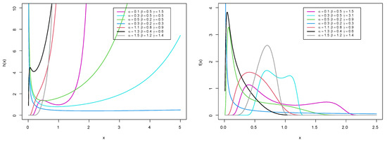 where is the quantile function of the variable X. The plots of and are given, in Figure 2, for various choices of and as . Figure 3 presents the graphs for some other values of and when . These figures reveal that the OFW-W is adequate for describing the negatively and positively skewed data.
