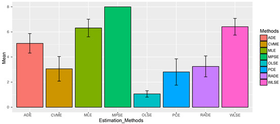 where is an estimator of the vector parameter According to the empirical results of the simulation offered in Table 1, Table 2, Table 3, Table 4 and Table 5, we observe that the consistency characteristic for the ML, CVM, LS, PC, WLS, MPS, AD, and RAD estimators is satisfied as n grows. This means that all studied procedures can be utilized effectively to assess the OFW-W parameters. Figure 4 presents the mean and standard deviation for the ranking of the various estimation methods based on the simulation results.