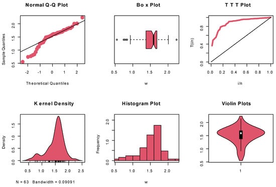 The data studied here were initially collected by the researchers at the UK’s National Physical Laboratory (NPL) and was introduced by Smith and Naylor [30] to represent 63 readings of the solidity of 1.5 cm glass fibers. Table 6 specifies the maximum likelihood (ML) estimators, Kolmogorov–Smirnov (K-S) values, and the corresponding p-values for all compared distributions. It is evident that the new model has the largest p-value and the smallest K-S value. Moreover, the goodness-of-fit (GOF) measures confirm that the OFW-W model has the smallest values of , , and . Based on these results, the OFW-W model is the best for describing the first dataset compared to the other five competitive models.
