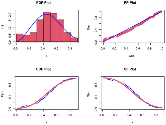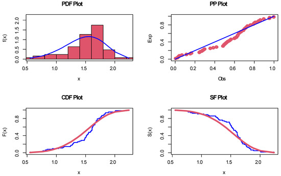 The appreciated PDF, PP, CDF, and SF plots of data II.