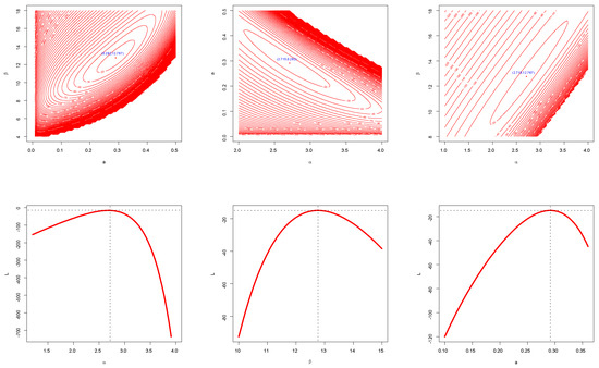 Figure 9 represents the QQ, box, TTT, KD, histogram, and violin plots, showing that dataset II appears to be nearly symmetric with no extreme values found. Figure 10 displays the estimated PDF, CDF, P-P, and SF plots for this data. Figure 11 presents the contour and profile plots of the log-likelihood functions for and of dataset II, revealing that the OFW-W parameters are unimodal.