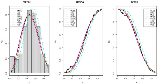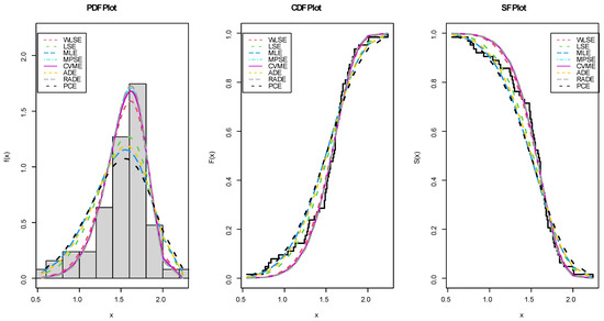 The WLS, LS, ML, MPS, CVM, AD, RAD, and PC estimators are listed in Table 9 along with the p-values and K-S values of the OFW-W model. We can observe in Table 9 that the different estimation methods perform best for modeling data set II, with ADE and PCE being the most effective procedures. The estimated CDFs, PDFs, and SFs are illustrated in Figure 12.