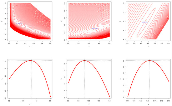 The contour and profile of log-likelihood functions plots for , , and of dataset II.