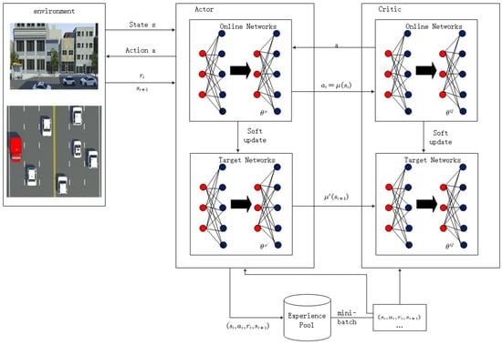 Firstly, based on the information of the autonomous vehicles interacting with the environment, the Actor-online network gives the action in the current state and passes it to the Critic-online network. The Critic-online network calculates based on the state and action , which is used to evaluate the value of the current state-action. After executing action , the state transitions to state . The Actor-online network identifies the optimal subsequent action for state and passes to the Critic-target network. The Critic-target network generates , and the autonomous vehicle receives the environmental reward to derive the target Q-value.
