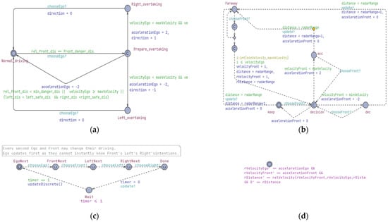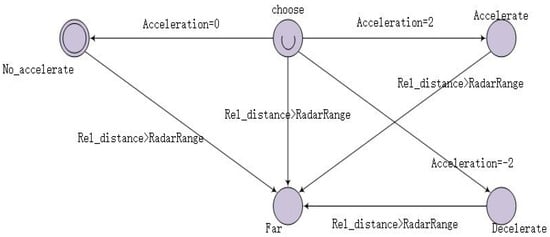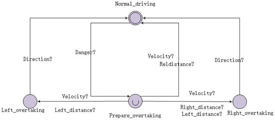Figure 2 shows the abstract representation of the autonomous driving vehicle model ADS. It mainly includes the normal driving state, Normal_driving; the preparation overtaking state, Prepare_overtaking; the right overtaking state, Right_overtaking; and the left overtaking state, Left_overtaking. When the distance between the autonomous vehicle and the vehicle ahead reaches a specified hazard distance, the autonomous driving vehicle enters from the normal driving state to the state of preparing to change lanes to overtake the vehicle. At this point, the autonomous driving vehicle determines the current conditions for changing lanes. If the conditions are met, the autonomous driving vehicle moves to the left or right to change lanes. After changing lanes, the autonomous driving vehicle adjusts itself and travels normally. If the condition is not met, the autonomous driving vehicle slows down to continue on the current roadway. In order to make the scenarios more realistic, this paper specifies that the priority of autonomous driving vehicle changing lanes to the left is greater than the priority of changing lanes to the right.