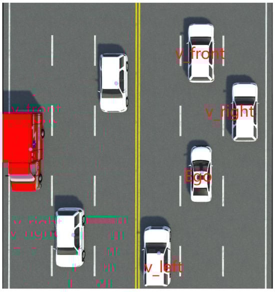 The scenario shown in Figure 4 contains weather information, road information, and vehicle information. Road information includes maximum speed limit, minimum speed limit, etc. Weather information includes rainy, cloudy, sunny, and foggy. Our scenario contains four vehicle entities. The autonomous vehicle serving as the observation subject, referred to as Ego. The front vehicle v_Front, the right-side vehicle v_Right, and the left-side vehicle v_Left. In the scenario, the roads constructed by CARLA are symmetric roads. Therefore, during the AV’s driving process, it can assess whether it remains centered on the road by observing the angle of deviation from the road’s central line. In the current scenario, to reach its destination as quickly as possible, the autonomous vehicle must engage in lane-changing maneuvers. Throughout the lane change process, the autonomous vehicle needs to maintain a safe distance from surrounding vehicles. However, due to the impact of road conditions and weather changes, the safety of the lane-changing maneuvers performed by the autonomous vehicle remains uncertain. In the driving scenario, environmental factors such as weather and road conditions are crucial. The ADS relies on sensors to collect information about weather, road boundaries, traffic signs, and other scene elements. These environmental factors serve as key components for decision-making, interacting with the reward function to generate appropriate driving actions tailored to the current driving scenario.