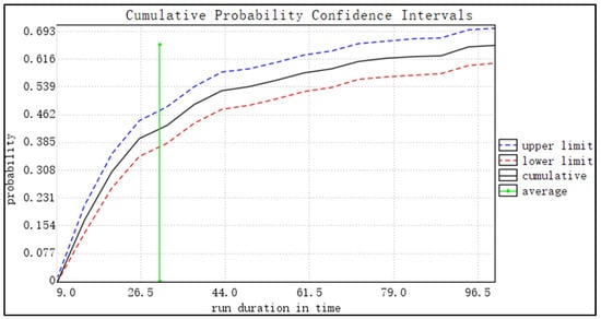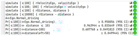 Next, we analyze its property P1 in detail. P1 represents the probability of safety for an autonomous vehicle when the distance to the preceding vehicle exceeds 100 units. The unit of 100 is denoted in meters. Figure 8 indicates that we obtain a confidence interval of [0.607081, 0.704599] after 382 simulations, where the confidence level is 0.66. The safety of the autonomous vehicle is acceptable when the distance between the autonomous vehicle and the vehicle in front of it is greater than 100 m. We verify whether the probability of this safety property meets the given probability threshold, and when the verification passes, it indicates that the safety of the autonomous vehicle is guaranteed.