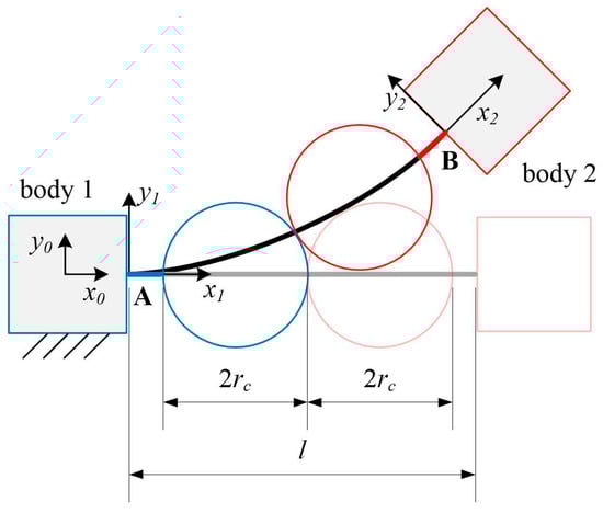 This means that one can use a pseudo-rigid model with a single degree of freedom for describing the nonlinear relative displacement of the connected bodies. This is a very relevant simplification for two main reasons. The first reason is that a single degree of freedom mechanism means a less complex structure and fewer equations to be solved. The second reason is that a single degree of freedom can lead to a completely determinate system for which the deformation following an imposed displacement can be determined without solving the elastic equilibrium equations but only by imposing the closure-loop equations of a generic rigid-body mechanism. The advanced pseudo-rigid mechanism can be implemented as an epicyclic arrangement as if the circles were gears meshing with each other. In the initial configuration of the undeformed beam, the circles touch each other at the midpoint of the beam itself, respecting the symmetry of the structure. The radius of these circles is proportional to the length of the flexible segment and can be approximated by the formula [42]: