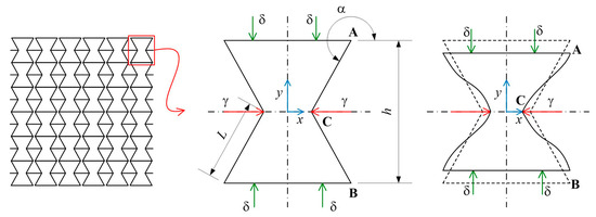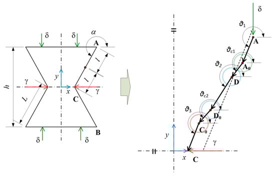 With this important premise, the relationship between the input and output ports of the compliant cell can be studied using the mechanism closure loop equations for canonical rigid-link mechanisms. With reference to Figure 4, let us consider a symmetrical re-entrant cell with height and diagonal beam inclination . Due to symmetry, as already discussed, we can study the behavior of the cell focusing only on a quarter and imposing boundary constraints. Let us also prescribe a vertical displacement at input point A that produces a horizontal resulting displacement at output point C. The closure loop equations can be written as follows: