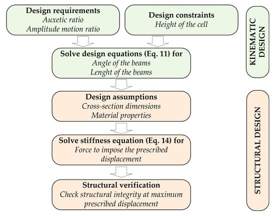 With reference to Figure 5, which shows a flow chart of the proposed design of the auxetic cell, the design procedure of the re-entrant cell can be split between the elasto-kinematic part and the structural part. The kinematic design starts with the knowledge of the design constraints (i.e., the height of the cell ) and the design requirements (the auxetic behavior and the nominal input displacement at which the desired auxetic behavior is expected). Then, by solving Equation (11), it is possible to find the value of , the length of the beams, and the angle of the pseudo-rigid intermediate links, completing the synthesis. After the elasto-kinematic synthesis, the design moves to the structural part in which the cross-section geometries and material properties can be chosen in order to fulfill the desired stiffness and resistance requirements. They may be chosen as design assumptions. The amplitude of the required force for producing the prescribed vertical displacement can be assessed using Equation (14), where the values and are the output variables of the elasto-kinematic design. Also, the structural design may be accomplished by prescribing the required force and finding the cross-section dimensions according to Equation (14). Having decoupled the kinematic design from the structural one allows this double independent approach, which can be chosen according to the cases of interest.
