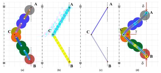 Figure 6a shows the second-order epicyclic pseudo-rigid model of the half cell in the undeformed condition. The two central links are connected at the common end (point C) with a fixed joint, which constrains all the three degrees of freedom of the coincident points. The ends of the first and last links (A and B) are then constrained to move along the y axis and are subjected to an imposed symmetrical displacement of amplitude (the upper point is moved downward, and the lower point is moved upward). Due to the symmetry of the model, the displacement of point C is constrained along the x axis (no parasitic motion).