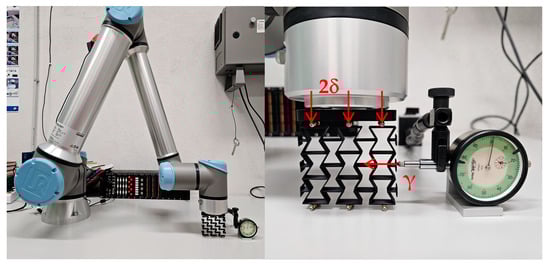 The third verification was conducted with an experimental test bench. An auxetic structure of 3 × 3 cells, whose dimensions are reported in Table 1, was printed with a Zortrax M300 plus printer (by Zortrax S.A., Olsztyn, Poland) using Z-ABS material and maximum infill. Values of material properties in Table 1 refer to the datasheet provided by the manufacturer. The printing direction was aligned to the transverse axis (z axis of Figure 3). The structure was placed on a rigid plane in contact with the bottom surface, and a controlled displacement was applied to the upper surface by means of the end-effector of a UR10e cobot (Figure 7). To reduce friction effects, small rollers are placed at the interface between the structure and the bottom plane and between the structure and the cobot end-effector. The lateral displacement was measured using an analogic centesimal gauge with a resolution of 0.01 mm in contact with the central lateral cell in order to reduce the contribution of boundary constraint effects. The displacement was applied with six equally spaced steps from 0 to , recording the corresponding contraction . Measurements were repeated five times to increase statistical significance. Real-time communication with the cobot was implemented using a Python 3.6 script that includes the UR_RTDE library (the library and its documentation, including examples, can be downloaded at https://sdurobotics.gitlab.io/ur_rtde/ (accessed on 22 November 2024)) for imposing controlled movement using the Real Time Data Exchange protocol. The displacement was applied using the MOVEL command, which prescribes an interpolation in the Cartesian space. Although the cobot has a load cell placed at its end-effector, evaluating the actuation forces was not considered significant because of the effects of boundary deformations and contact friction, which would have made the results between the experiments and the three simulative models not directly comparable.