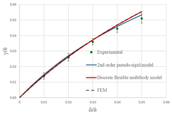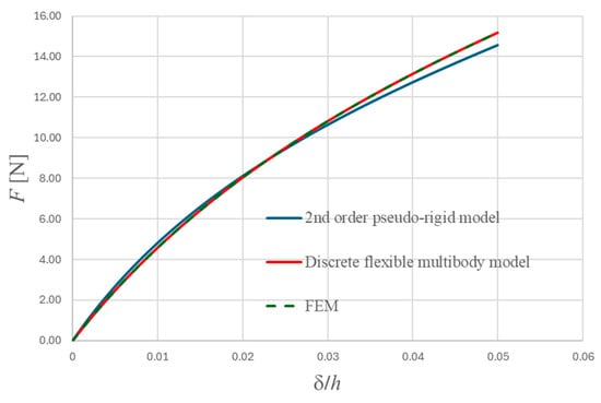 Figure 9 presents the graphical comparison between the forces computed to impose the prescribed vertical displacement between the second-order pseudo-rigid model, the discrete flexible multibody model, and the finite element model. The forces refer to the contribution of only half the cell, as all the models include only half the cell for symmetry.