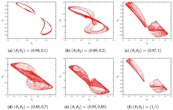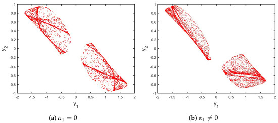 From Equation (2) of (12), , replacing in Equation (1), for it becomes apparent that the system (12) has no solution. Therefore, the incommensurate discrete memristive system (11) can create hidden chaotic attractors and exhibits asymmetry if as shown in Figure 1. For more details, hidden attractors may manifest in a symmetric dynamic manner that preserves the symmetry of the system; their trajectories may mirror or repeat within symmetrical boundaries of the phase space of the incommensurate discrete memristive system. This may result in periodic or symmetric chaotic behavior, whereas hidden attractors may show skewed or irregular dynamics in asymmetric dynamic, disrupting the system’s apparent regularity. Our results indicate that the hidden attractor does not originate from the local dynamics around the equilibrium points. This confirms that the attractor is hidden, as it can only be detected under specific initial conditions away from the vicinity of equilibrium.