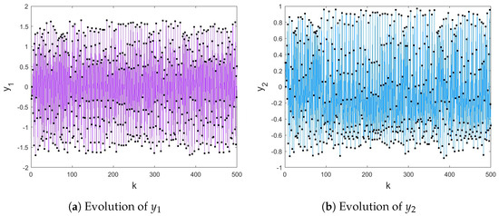 Set the parameters , , and the initial condition (IN): . First, Figure 2 portrays the evolution states of the incommensurate discrete memristive system (11) for , while the resulting hidden asymmetry chaotic attractor for different incommensurate orders as shown in Figure 3. Therefore, these findings show that the form of the hidden attractors of (11) is affected by the selection of the incommensurate orders.