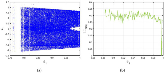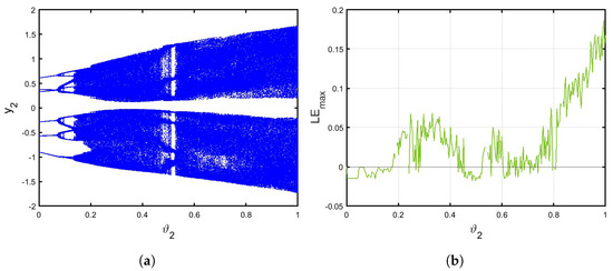 - Figure 6 displays two bifurcation diagrams and their associated graph of for versus in correspond to the incommensurate values and . We can see that, when , the trajectories of the a novel incommensurate discrete memristive system (11) are totally chaotic in the interval . When , the dynamics of the system shift from periodic to chaotic. If , there is periodic behavior where values are negative; otherwise, if increases the takes their higher values, indicating that the chaotic region expanded.