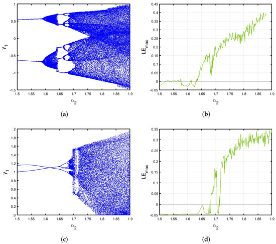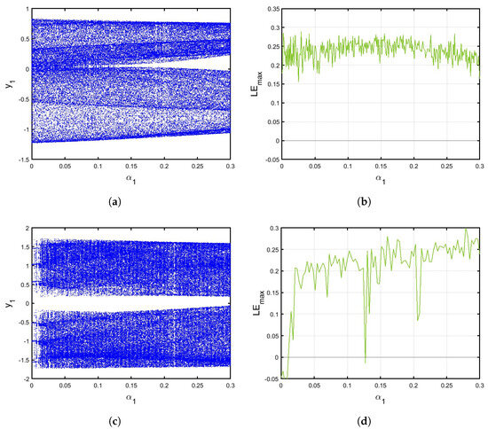 Figure 6. Bifurcation and the associated of (11) versus for (a,b) ; (c,d) = (1,0.97).Now, in Figure 7 versus in and when choosing , the trajectories exhibit the system ranging from periodic to chaotic. Specifically, Figure 7a shows that the behaviors of the incommensurate discrete memristive system (11) transition between regular and period-doubling bifurcation. When at , the trajectories are periodic with negative values of , while when , the system becomes period-doubling bifurcation where the values are positive, as shown in Figure 7b. Furthermore, when increases, the system exhibits a divergence towards infinity. In addition, in Figure 7c, we can see that the chaotic motions appear when , while show periodic windows with 2-period orbits, at also indicating the periodic orbit of the system where the alternates between positive values and negative values, as seen in Figure 7d. When increases and becomes close to , the map the chaotic region expanded. It is apparent that the behaviors of (11) are influenced by the incommensurate derivative order . It is simple to see that the two suggested incommensurate derivatives have distinct shapes.