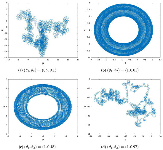 Therefore, the plots of the incommensurate discrete memristive system (11) for different incommensurate values can be seen in Figure 8. Particularly, when in Figure 8a and in Figure 8b they display bounded-like states, indicating a periodic nature of the system. When , they show Brownian-like states. Figure 8c and , as well as Figure 8d affirm that the incommensurate system is chaotic. Then, these findings are consistent with the bifurcation and ().