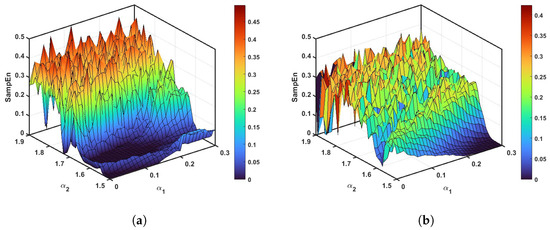 The complexity of the incommensurate discrete memristive system (11) is measured using the sample entropy (SampEn) [43,44] in this part when large values of SampEn signify a greater level of complexity. The SampEn algorithm is considered as follows: