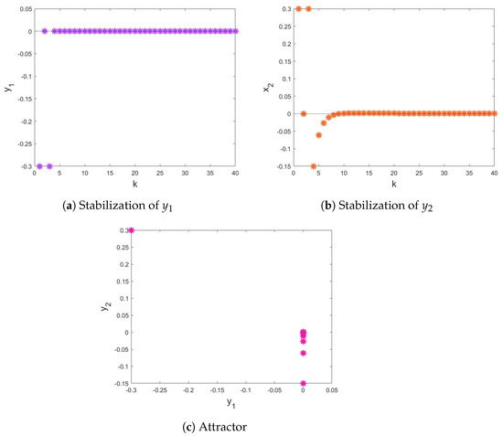 Based on Theorem 2, and since a consequence of , in the direction of , the (27) is asymptotically stable. Figure 11 highlights the stabilization of the controlled incommensurate discrete memristive system (27) for by showing how the system asymptotically becomes .