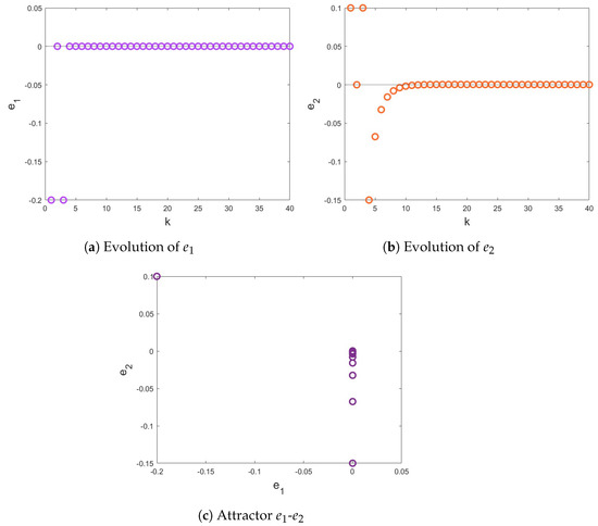 Thus, the eigenvalues of B are , , which satisfy the condition of Theorem 2. Then, the control law (35) realizes the synchronization of the drive (11) and the response (32) incommensurate discrete memristive system. Using numerical simulations, this outcome is shown, wherein we chose , and Figure 12 displays the states and attractor of the error (36). Evidently, the errors are getting closer to zero, which confirms the synchronization outcomes. □