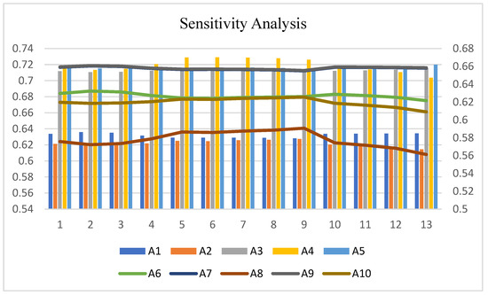 In Equation (14), represents the utility function of the ideal solution, whereas represents the utility function of the anti-ideal solution. Equations (15) and (16) were used to determine and .