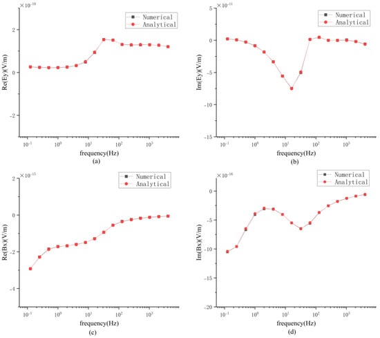 For a clear comparison, the analytical solutions were obtained using Key’s one-dimensional controlled-source electromagnetic forward modeling algorithm [56], which was compared with the numerical solutions derived from the algorithm presented in this paper. The response curves are shown in Figure 3. The X-axis represents frequency. The top two plots display the real and imaginary parts of the y-component of the electric field, while the bottom two plots show the real and imaginary parts of the x-component of the magnetic field. It can be observed that the numerical solutions are in good agreement with the analytical solutions.