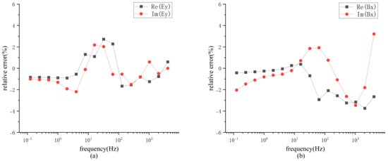 Comparison of relative amplitude errors between numerical and analytical solutions for the layered model. (a) Electric field Ey component and (b) magnetic field Bx component.