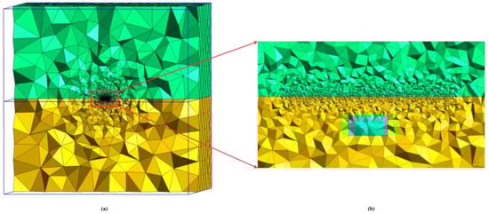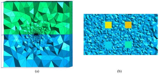 Figure 2b shows the mesh generated using the open-source mesh generation program Gmsh [55]. During the meshing process, local refinement was applied near the source and measurement lines. Ultimately, the stratified model was discretized into 58,375 nodes and 352,204 tetrahedra.