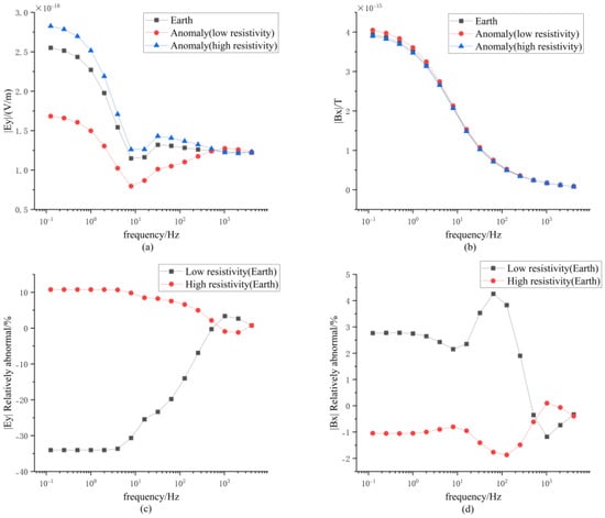 Numerical simulations were performed on the uniform half-space model, the low-resistivity anomaly model, and the high-resistivity anomaly model, plotting the amplitudes of the electric field’s y-component (Ey) and the magnetic field’s x-component (Bx). The results are presented in Figure 7. From Figure 7a, it can be seen that the amplitude intensity of the electric field component decreases in the order of low-resistivity anomaly, uniform half-space, and high-resistivity anomaly. The differences in amplitude intensity are most pronounced at low frequencies, gradually decreasing with increasing frequency until they become nearly uniform. This is mainly attributed to the longer wavelengths and greater penetration capabilities of low-frequency electromagnetic waves, whereas high-frequency waves have shorter wavelengths and weaker penetration, primarily conveying information about the background resistivity between the anomaly and the ground surface. The relative anomaly curve of the Ey amplitude is depicted in Figure 7c, which shows that the relative anomalies of the low-resistivity anomaly compared to the uniform half-space are notably larger than those of the high-resistivity anomaly relative to the uniform half-space, and these differences decrease with increasing frequency. Figure 7b,d show the amplitude and relative anomaly curves of the Bx component, respectively. It can be observed that the amplitude differences of the Bx component among the low-resistivity anomaly, the uniform half-space, and the high-resistivity anomaly are relatively minor, with all relative anomalies having absolute values within 5%.