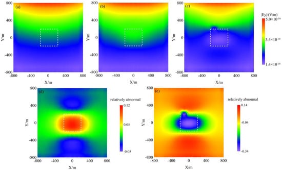 Amplitude of the Ey component at the surface for the single anomaly model at 0.5 Hz. (a) Background model (no anomaly); (b) high-resistivity anomaly present; (c) high-resistivity anomaly present; (d) relative anomaly ((b) vs. (a)); and (e) relative anomaly ((c) vs. (a)).