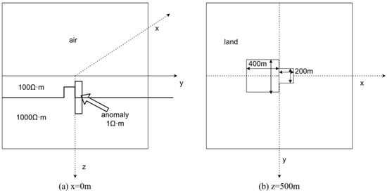 Geometric structure of Model 4. (a) x = 0, left side showing a protruding hexahedron in the lower layer, and the right side showing a low-resistivity anomaly; and (b) z = 500 m, displaying the subsurface structure and anomaly distribution.