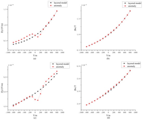 Amplitude curve of Model 4. (a) Amplitude curve of Ey (32 Hz); (b) amplitude curve of Bx (32 Hz); (c) amplitude curve of Ey (0.5 Hz); and (d) amplitude curve of Bx (0.5 Hz).