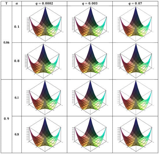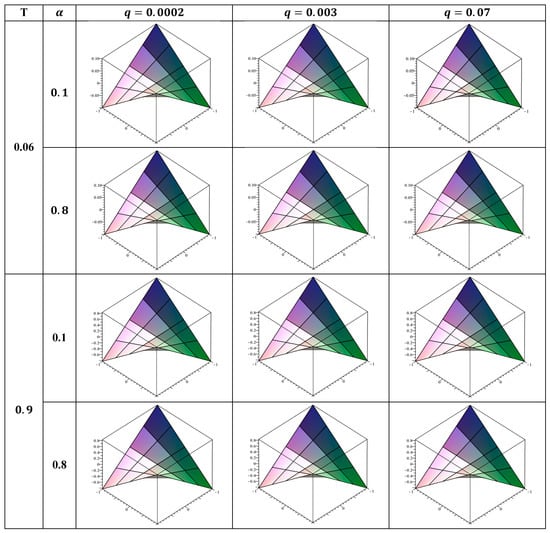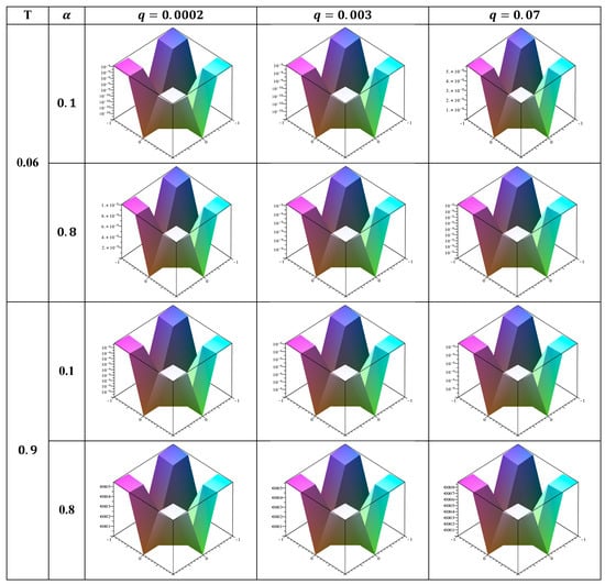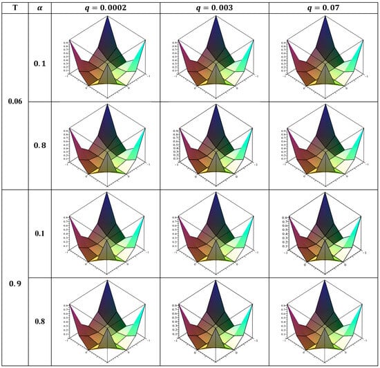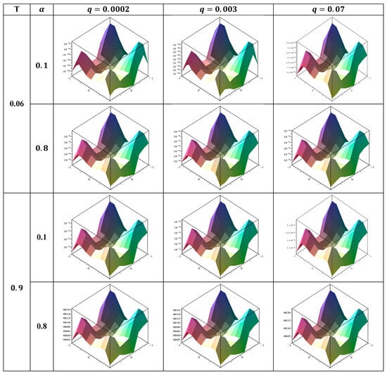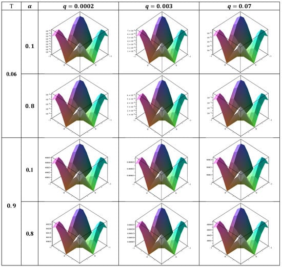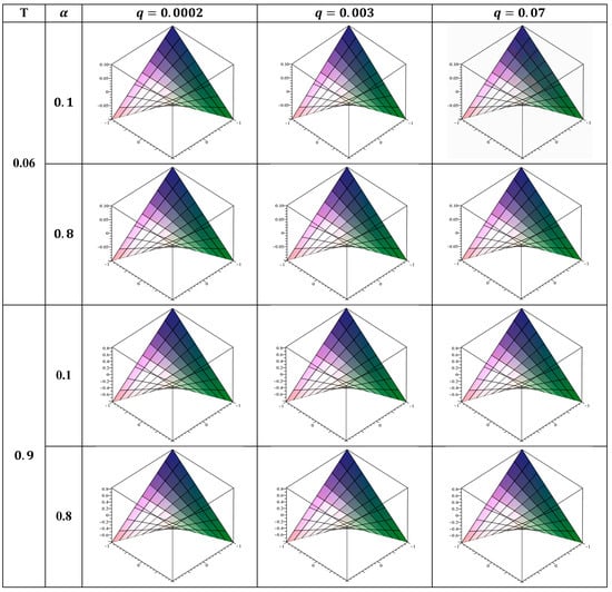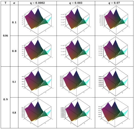 The approximate solution of Equation (61) has the following accuracy values for and for when T = 0.06; for 8 and for when T = 0.9. These values are shown in Table 5 and Table 6. Note that if both and are positive or negative, the function Φ and, consequently, the approximate solution, are logically positive; if one is positive and the other is negative, the function is logically negative.